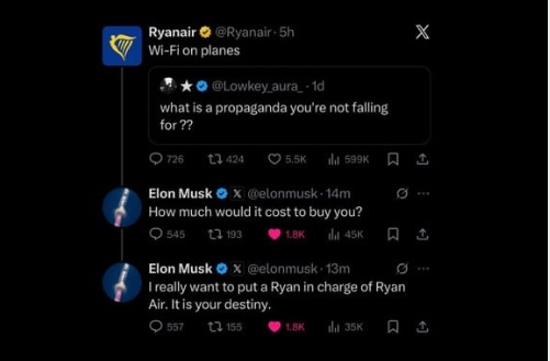 Musk je odgovorio na duhovitu objavu zrakoplovne tvrtke na X-u u kojoj se čini da se protivi dodavanju Wi-Fi-ja u avione, pitajući Ryanair: "Koliko bi koštalo da vas kupim?", a zatim dodajući: "Stvarno želim postaviti Ryana na čelo Ryan Aira. To je vaša sudbina."